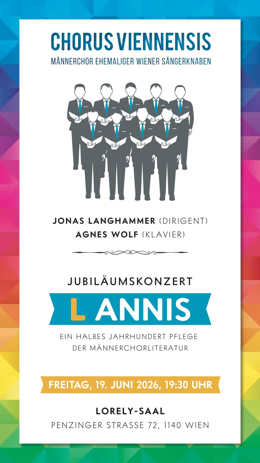 Der Chorus Viennensis vereint ehemalige Wiener Sängerknaben zu einem renommierten Männerchor. Auf dem Programm stehen Meisterwerke von der Wiener Klassik bis zur Gegenwart – mit besonderen Schätzen österreichischer und internationaler Komponist_innen. Anlässlich des 50-jährigen Jubiläums als reiner Männerchor präsentiert das Ensemble im Lorely-Saal ein buntes Programm unter der Leitung von Jonas Langhammer, teilweise begleitet am Klavier von Agnes Wolf.